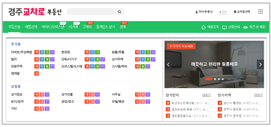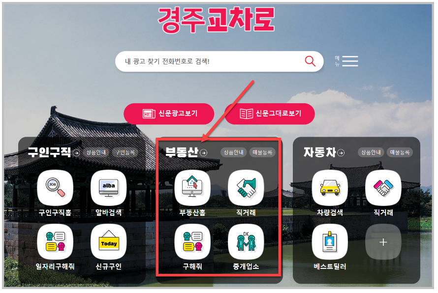 또는 위 링크를 통해서도 포털에 접속하는 같은 결과를 얻을 수 있습니다. 해당 사이트에 접속한 이후에, 사진에 표시된 것 처럼 부동산을 클릭하면 경주교차로 부동산 홈페이지로 이동할 수 있습니다.