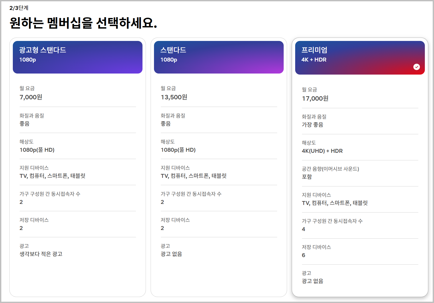 - 프리미엄 (월 17,000원): 광고 없이 UHD(4K) 및 HDR 화질 제공, 동시에 4명 시청 가능.