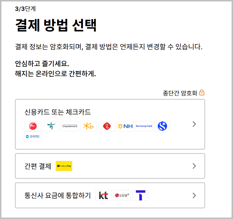 - 신용카드 또는 체크카드: 카드 번호, 유효기간, CVC, 생년월일 입력