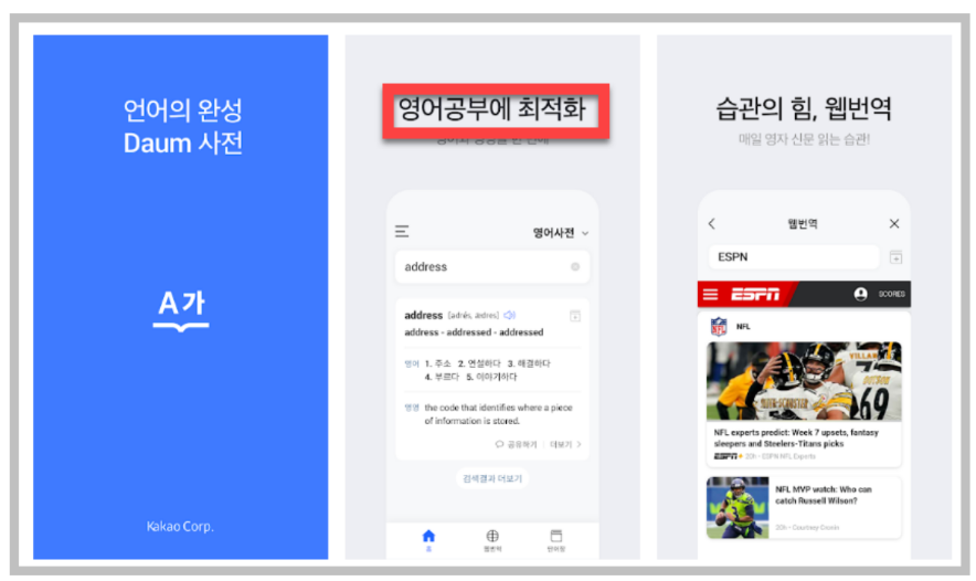 가장 대표적인 사전 앱은 네이버와 다음입니다. 저는 그중에서도 다음 사전을 자주 애용하는데 그 이유는 다음사전이 ‘공부’에 적합하기 때문입니다. 다음 사전은 공부에 최적화된 기능이 많고, 네이버의 경우에는 일상해서 간단하게 검색하기 좋은 앱이라고 생각합니다.