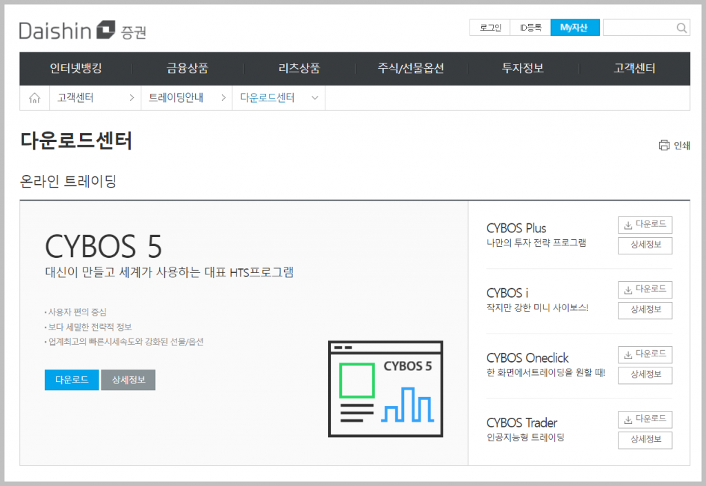 위와 같은 화면이 나타나면 정확하게 접속한 것입니다. 이곳에 뜨는 여러 가지 HTS 중에서도 특별한 경우가 아니라면 CYBOS 5를 다운로드하는 것이 일반적입니다.