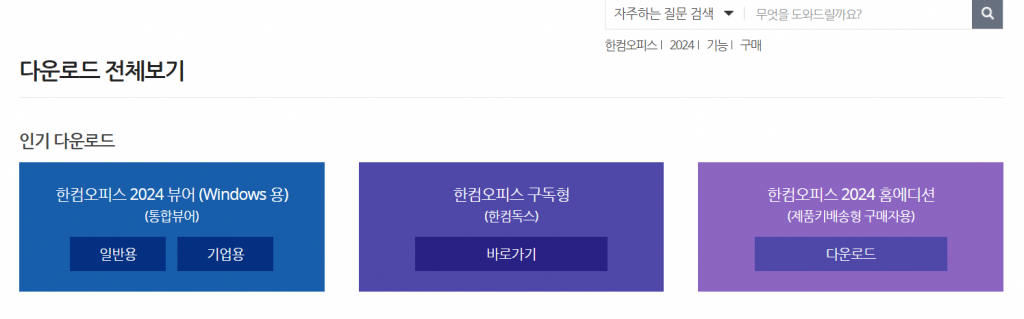 해당 페이지에 접속하면 위와 같은 화면을 볼 수 있으며 2024 뷰어 중 사용 목적에 맞게 일반용 또는 기업용을 선택하여 이용할 수 있습니다.