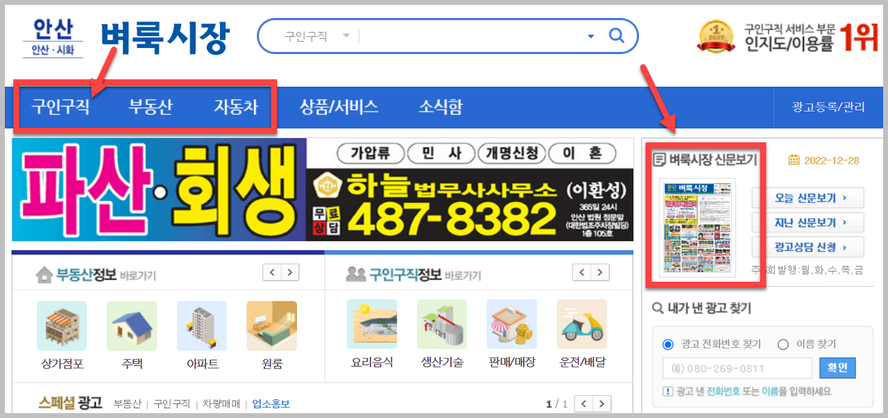 해당 사이트에 접속하면 다음과 같은 화면을 확인할 수 있습니다. 가장 활발한 게시판은 역시 구인구직, 부동산, 자동차 입니다. 지역적 특성이 가장 잘 반영된 것이기 때문입니다. 따라서 안산지역 구인구직 광고를 보고싶다면 구인구직 게시판으로, 부동산과 관련된 광고를 보고 싶다면 부동산게시판을 방문하는 것을 추천드립니다.