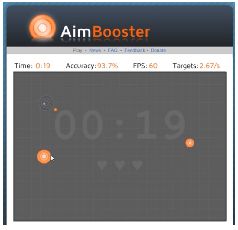 첫번째, '에임부스터'는 에임을 향상시키기 위한 훈련을 제공하는 에임 연습 사이트입니다. 위 링크를 통해 곧바로 접속할 수 있습니다. 또는 검색해도 동일한 결과를 얻을 수 있습니다. 이곳은 회원가입 없이 즉시 연습을 시작할 수 있다는 점이 편리한것 같습니다. 시간과 정확성 타겟을 확인할 수 있어서 마음에 드네요.