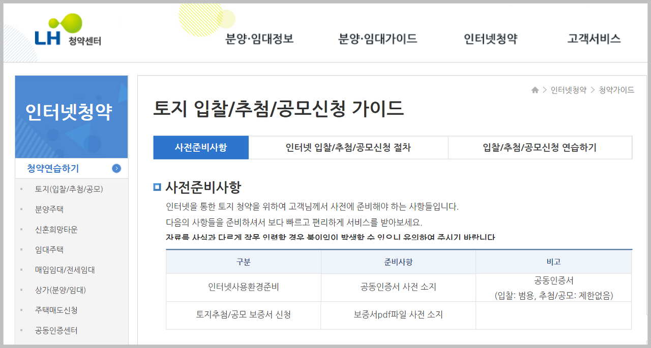 엘에이치 청약센터 홈페이지에서 가이드를 들어가면 다음과 같이 연습과 사전 준비사항을 잘 공지하고 있습니다. 자료를 사실과 다르게 입력할 경우 불이익이 발생할 수 있으니 이점 유의하시길 바랍니다.