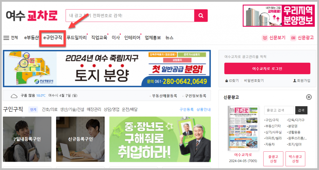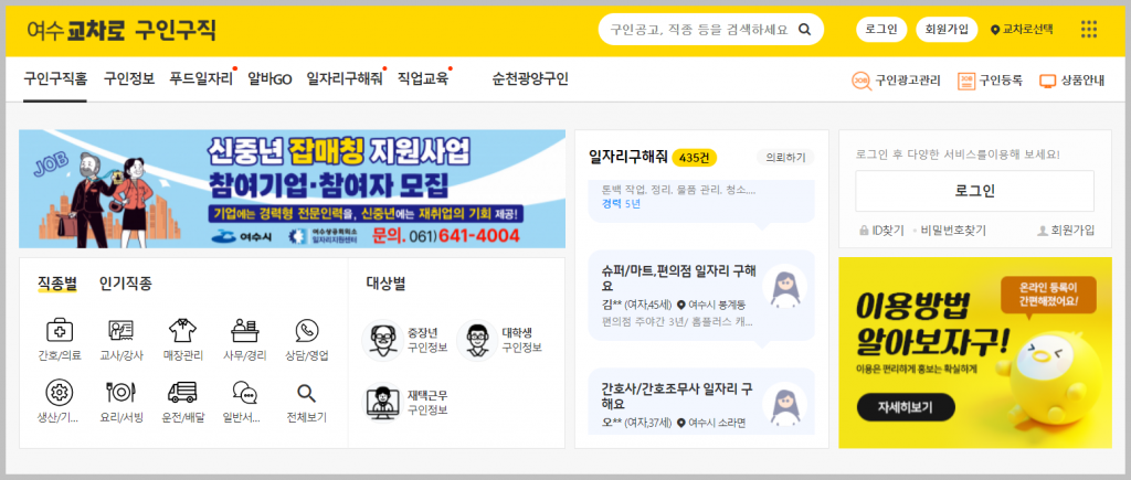 홈페이지에 접속하면 위와 같은 모습을 볼 수 있습니다. 이곳에서 E구인구직을 클릭하면 바로 이동하 수 있습니다. 예전에는 교차로 잡이라는 사이트의 하부 도메인으로 운영되었지만, 이제는 여수교차로 자체 호스팅으로 운영되는 것 같습니다.
