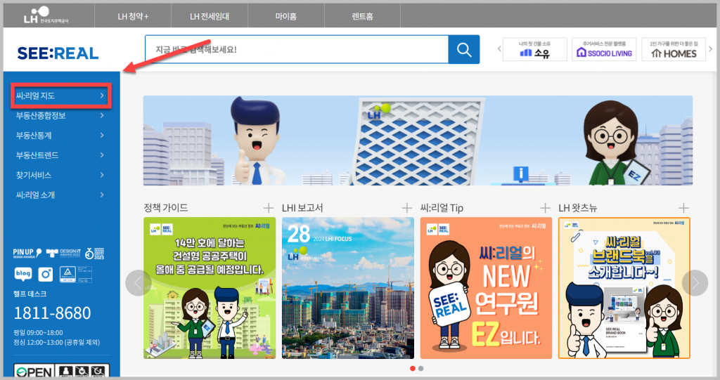 홈페이지에 접속하면 위와 같은 화면을 볼 수 있으며 씨리얼 지도를 클릭하면 과거 온나라지도와 동일한 것을 볼 수 있습니다. 이 외에도 가격검색, 개발사업지구, 인구정보, 주택정보, 다필지분석지도 등 다양한 서비스가 존재하니 참고하시길 바랍니다. 지도 외에도 복잡한 부동산 정보를 카드뉴스 형태로 쉽게 이해할 수 있고, 최신 트렌드도 빠르게 파악할 수 있는 곳 입니다.