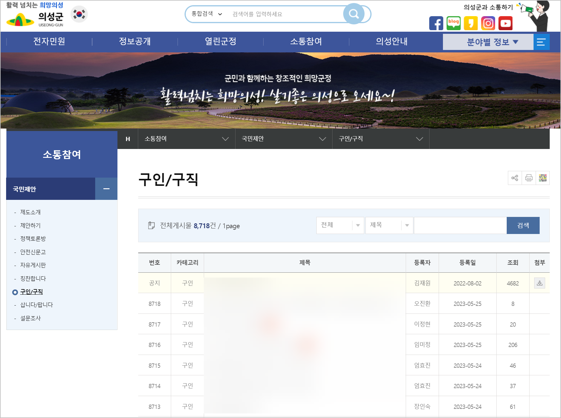 의성군청은 공식 홈페이지를 통해 구인구직 정보를 제공하고 있으며, 일자리통합지원플랫폼을 운영하여 다양한 구인구직 정보를 한 곳에서 확인할 수 있도록 도와줍니다.