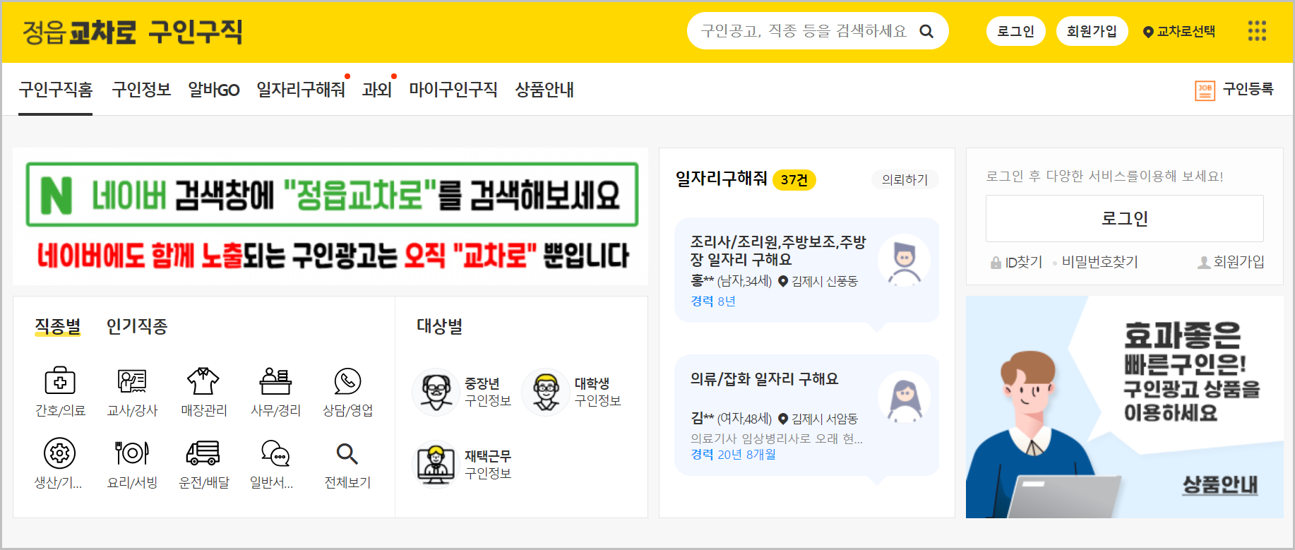 정읍교차로 홈페이지에 방문하기 위해서는 네이버나 다음등 포털 서비스를 경유해서 들어가면 편리합니다. 하지만 조금 편리하게 아래의 링크를 클릭하셔도 들어가실 수 있습니다.