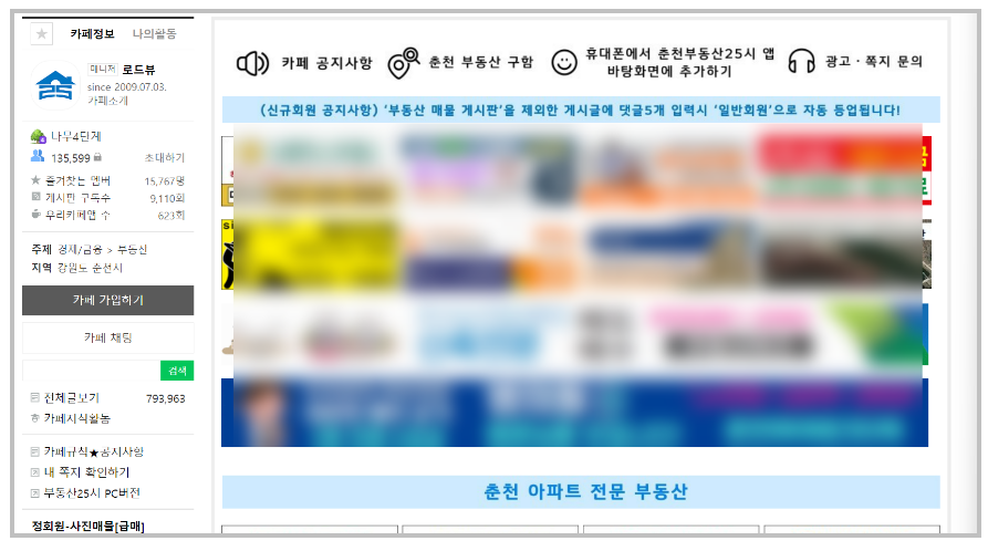 사실 춘천 부동산 25시는 특정 홈페이지나 사이트가 아니라 네이버 카페입니다. 그렇기에 어떤 서비스를 제공한다기 보다는 개개인의 부동산 관련 정보가 많이 올라오는 곳이라고 할 수있습니다.
