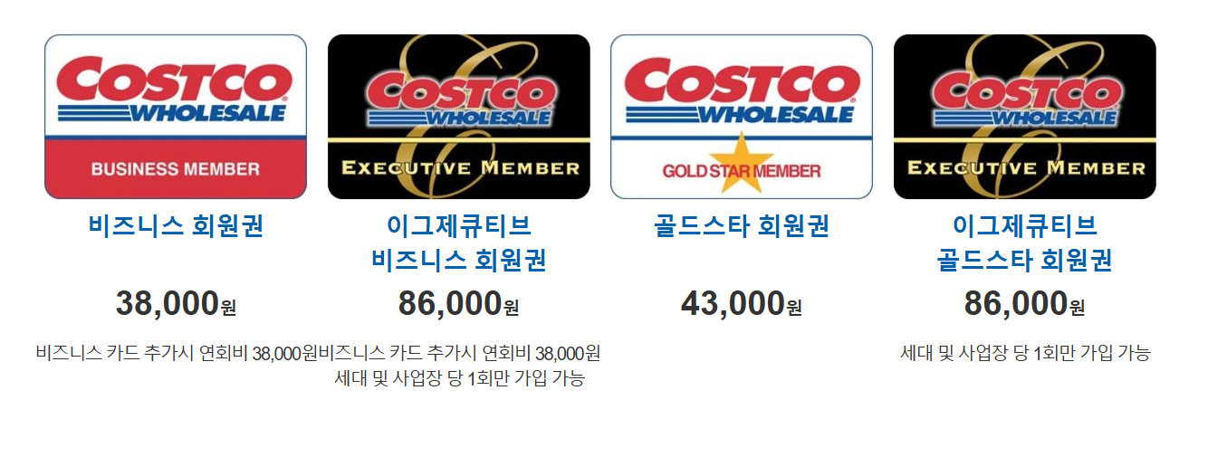 | 사업자용 | 비즈니스 | 38,000원 | 전 세계 코스트코 매장 이용 온라인몰 쇼핑 비즈니스 카드 추가 가능 (추가 연회비 발생) |
