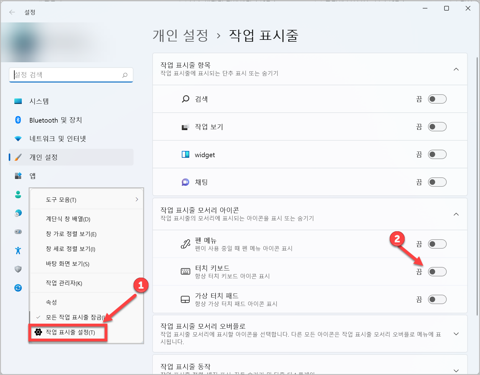 급한대로 사용할만한 터치키보드 켜는 방법에 대해서 이야기를 해보려고 합니다. 윈도우 맨아래 작업표시줄의 빈공간에서 우클릭을 하시면 메뉴가 나옵니다. 이곳에서 [작업표시줄 설정]을 클릭하시면 위와 같은 화면이 나오는데 여기에서 '터치키보드'를 활성화 합니다.
