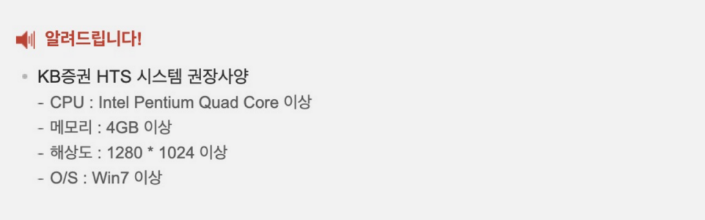 KB증권 HTS 시스템 권장 사양은 CPU는 인텔 펜티엄 쿼드코어 이상, 메모리 4기가 이상, 해상도는 1280 * 1024 이상, OS는 윈도우 7 이상입니다. 이는 권장 사양이므로 반드시 지켜야 하는 것은 아니지만, 해상도는 맞추는 것이 거래하는 데 편리할 것입니다.