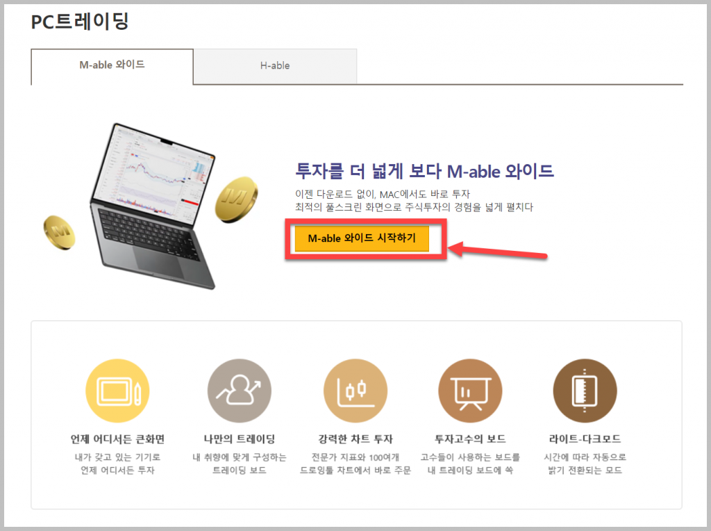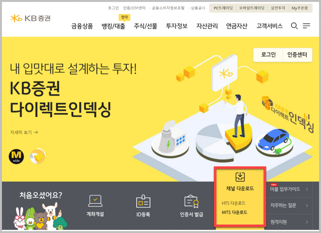 홈페이지에 접속하면 아래와 같은 메인 화면을 볼 수 있습니다. 화면 중간에 있는 '처음오셨어요' 를 클릭한 후 '채널 다운로드'를 클릭하면 바로 시스템을 설치할 수 있습니다. MTS 와 HTS 중 고를 수 있으며 굉장히 편리하게 설치할 수 있습니다.