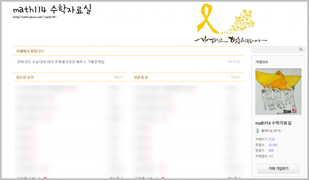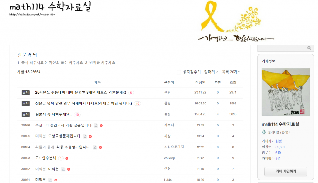이 카페에서는 주로 고등학교 2학년과 3학년 수준의 문제가 많이 올라옵니다. 일반 문제집도 많이 올라오지만 학교 기출문제와 같이 해설집이 없는 문제도 자주 올라옵니다. 또한 수행평가와 같은 것도 자주 올라오는 것을 볼 수 있습니다.