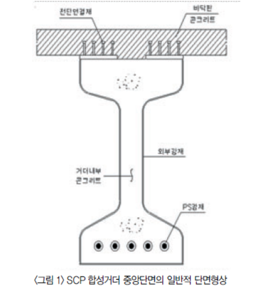강재로 구속된 프리스트레스 트 콘크리트 합성거더 (Steel - Confined Prestressed Concrete Girder, 이하 SCP 합성거 더)는 PSC I형거더와 유사한 단면형상을 하고 있 으나 I형단면의 외부는 강판으로 싸여있으며, PS 강재가 배치된 내부는 무근콘크리트로 채워지게 된다. SCP 합성거더 중앙단면의 일반적인 단면형 상은 그림 1 과 같다.
