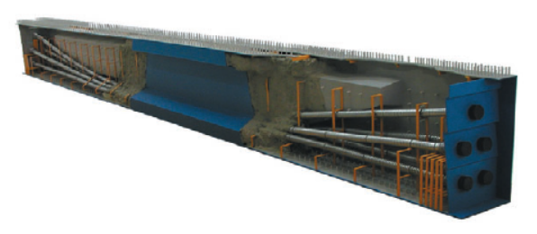 콘크리트를 둘러싸고 있는 외부의 강판이 전단 연결재에 의해 내부콘크리트와 합성됨에 따라 콘 크리트 내부에는 철근 배근이 필요하지 않게 된다. 인장을 받게 되는 거더의 최하단에 강재를 배치함 으로써 PS강재와 더불어 인장력에 저항하며, 콘크 리트의 인장균열로 인한 철근의 부식 등 균열발생 메카니즘의 형성으로 인한 내구성저하의 가능성을 근본적으로 차단할 수 있다.